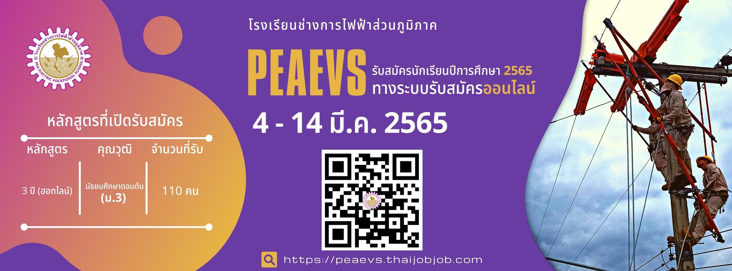 วิธีการรับสมัครรับสมัครสอบทางอินเทอร์เน็ต ตั้งแต่วันที่ 4 - 14 มีนาคม 2565 ตลอด 24 ชั่วโมง ไม่เว้นวันหยุดราชการ ที่เว็บไซต์ https://peaevs.thaijobjob.com/รายละเอียดเพิ่มเติม - ไฟล์ประกาศรับสมัคร